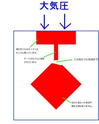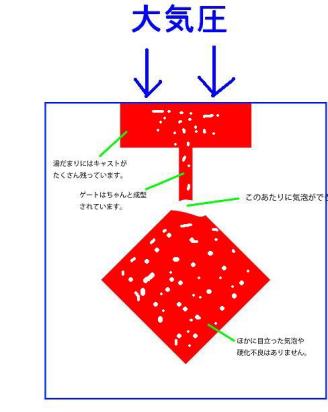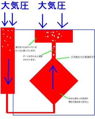 A大気圧に戻しても 大気圧で押さえつけられ、気泡が浮上できずに 一番高いところに集まる↓