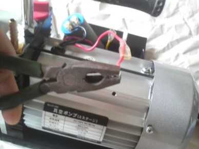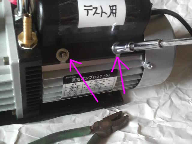 ↑ピンクの矢印のボルトを4本ゆるめます。8ミリの工具でゆるめますが、写真のようなペンチでもゆるむ場合があります。