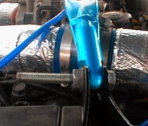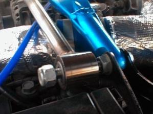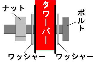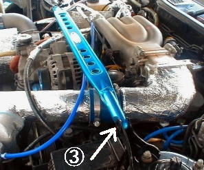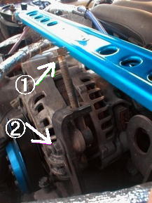 取り付け説明です。 まず、写真のAの矢印のナットがゆるんでいないか確認してください。 ゆるんでいたら、しっかりと締めてください。 次に オルタネーターのベルト張り調整用ボルトを外します(@の矢印) 純正タワーバーの、3の矢印のボルトを外します。 付属のボルト&ナットを装着します。 C本商品のゴムブッシュ側を装着します。 Dワッシャーを入れ、ゆるみ止めナットを仮止めします↓ 説明その2へGO!