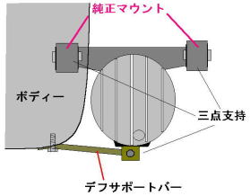 FD3Sのデフケースは、ノーマルでは2点支持で、ぶらさがっているだけすが、