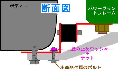 5.断面図の、本商品付属ボルトを必ず装着し、緩み止めワッシャー+ナットを装着してください。